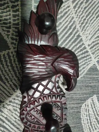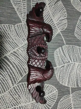 Perchero de madera oscura con un diseño rústico y tallado. - Representa águilas en relieve. - Tres ganchos para colgar. - Estilo artesanal.