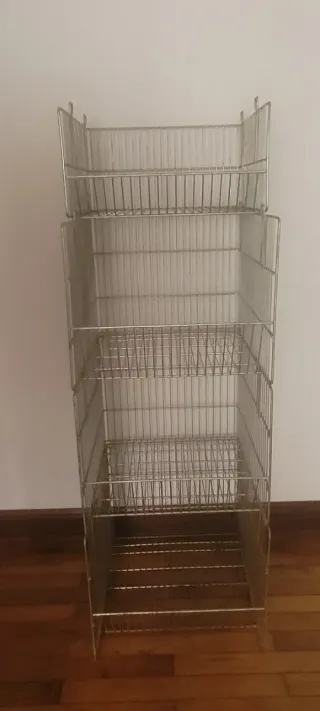 Conjunto de cestas metálicas apilables. Hay dos tamaños, 3 unid de tamaño : -Alto 43 cm -Ancho 48,5 cm -Profundo 55 cm. Una unidad de tamaño: -Alto 27,5 cm -Ancho 48,5 cm -Profundo 44 cm. La suma de los 4 cestones miden de Alto 150 cm. Tambien se venden por individual a 13 € la unidad del tamaño ,grande y a 12 € el tamaño pequeño. - Material: Metal - Diseño: Apilable - Color: Plateado