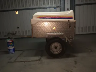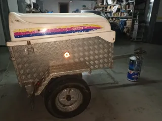 Remolque Alzaga documentado con caja de aluminio y tapa de fibra con llave, tiene también bandeja portaobjetos y alfombrilla de goma Rueda de 10 pulgadas, también admite en documentación de 12. Guardado en garaje . Se puede ver en Portugalete o Castro Urdiales .