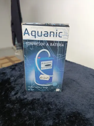 Compresor a batería Aquanic, ideal para acuarios. Es ligero y silencioso. - Incluye tubo atóxico y difusor. - Modelo: REF 5790. - Precio visible: €12.45.