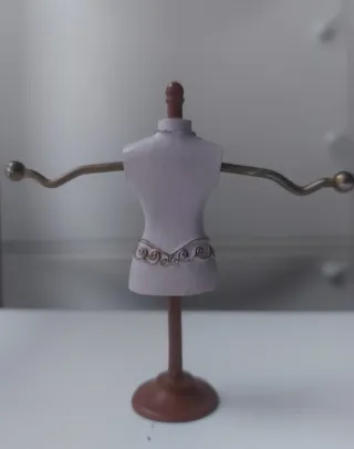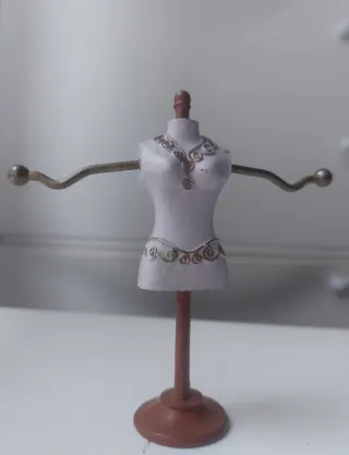 Original talla de madera con un diseño delicado, ideal para exhibir o guardar tus joyas. Alto: 10 cm Ancho: 10 cm Diámetro base: 2,5 cm - Soporte con forma de busto. - Brazos extensibles para colgar anillos. - Detalles ornamentales en dorado y morado.