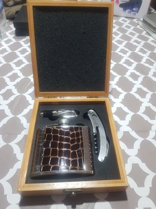 Petaca con abridor y servidor de vino. Nuevo en caja de madera sin estrenar. Ideal para regalo.
