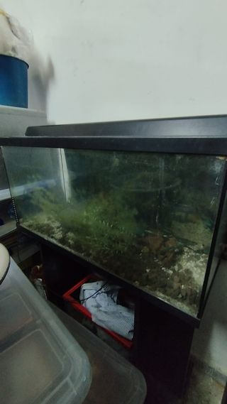 Acuario grande con mueble Se vende acuario de cristal con mueble incluido. ✔️ Capacidad aproximada: 100-120 litros. ✔️ Incluye tapa superior con iluminación. ( hay que cambiar el florescente) ✔️ Con mueble a medida para guardar accesorios o comida de peces. ✔️ Ideal para montar un acuario de agua dulce o salada. 📦 Estado: usado, necesita limpieza antes de montar. Cristales y estructura en buen estado. 📍 Entrega en mano.