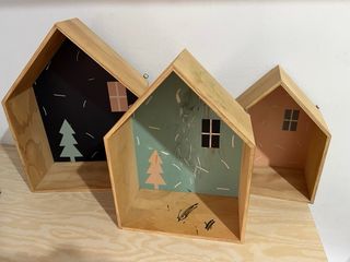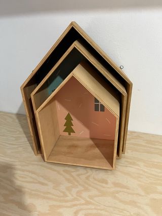 Conjunto de tres estanterías de madera con forma de casita, perfectas para decorar cualquier espacio. - Diseño escalonado. - Acabado en madera natural. - Están todas perfectas menos la de enmedio que está pintada.