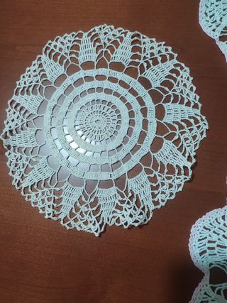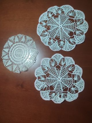 Conjunto de tres hermosos manteles individuales de ganchillo hechos a mano. Perfectos para añadir un toque de elegancia a tu mesa. - Diseño intrincado y delicado. - 2 Color blanco medidas 23 cmt uno. Y el otro 21 cmt. El más pequeño es de color beis, 18 cmt - Material de hilo de algodón.