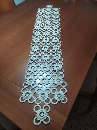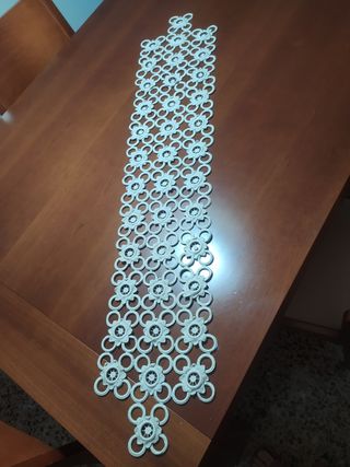 Elegante camino de mesa tejido a mano con un delicado diseño de flores y anillas. - Tejido de crochet. - Color beis. - Diseño floral. Medidas 104 cmt