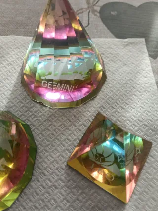 Adorno de cristal con forma de pirámide, decorado con los signos del zodiaco. - Diseño facetado que refleja la luz. - Incluye los signos: Capricornio, Piscis, Cáncer, Virgo y Géminis. - Pequeña pirámide adicional con un signo zodiacal.