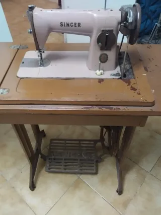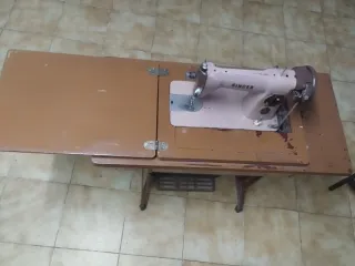 Máquina de coser antigua de la marca Singer, ideal para coleccionistas o amantes de la costura clásica. Se encuentra sobre una mesa de madera con compartimento. - Diseño vintage. - Marca: Singer.