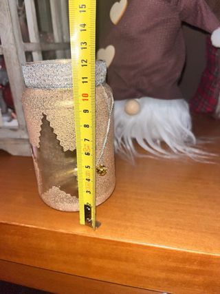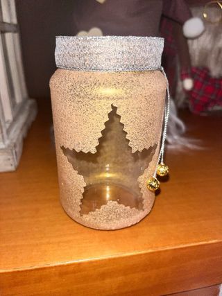 Portavelas decorativo con diseño de estrella, perfecto para crear un ambiente festivo. - Acabado dorado texturizado. - Cinta plateada en el borde superior. - Adorno colgante con cascabeles dorados.Lo puedes pedir del color que quieras y el tamaño un poco más grande ESTÁ SEMANA A ESTE PRECIO