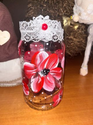 Tarro de cristal decorado a mano con flores rojas y detalles blancos. - Adornado con encaje blanco en la parte superior. - Diseño floral pintado. - Ideal como regalo o pieza decorativa.ideal para las mamis las iaias ☺️ ESTÁ SEMANA A ESTE PRECIO