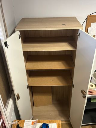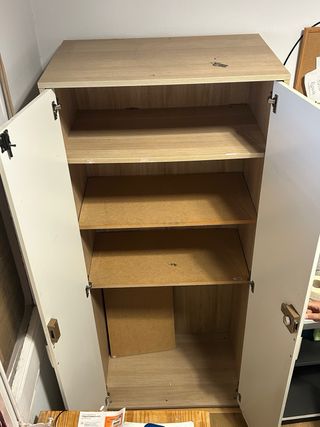 Armario de dos puertas con interior de madera y exterior blanco. - Puertas con bisagras. - Estantes interiores. - Tiradores metálicos.