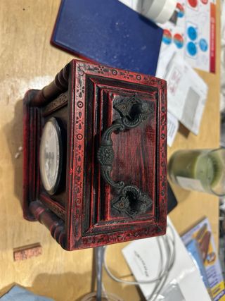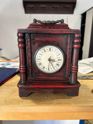 Elegante reloj de mesa con un diseño clásico y un acabado en rojo y negro que le da un toque vintage. - Estilo antiguo. - Detalles ornamentales. - Esfera con números romanos.