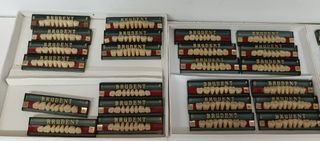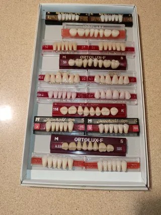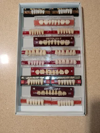 Conjunto de tablillas de dientes para prótesis dental de la marca BRUDENT,ODILUX Y LOGODENT/LOGODENT PLUS. - Variedad de modelos y tamaños. - Dientes de resina. - Incluye 2 guías de color ODILUX ODILUX: 56 tablillas anteriores y 52 posteriores LOGODENT PLUS: 29 tablillas anteriores y 36 posteriores BRUDENT: 18 tablillas anteriores y 36 posteriores. Venta por jubilación.