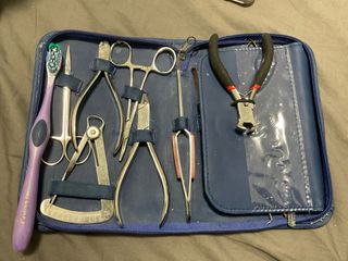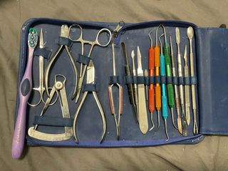 Estuche para prótesis dentales con varios instrumentos. - Cepillo - Tijeras pequeñas. - Pinzas. - Alicates. - Calibrador dental con escala en mm. - Pinzas de precisión. - Alicates de corte con mangos negros y rojos. Entre otros. Lo usé por dos años para el grado de prótesis dental, está completo.