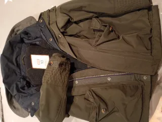 Chaqueta de niño de la marca Tizas, talla 10. Perfecta para el frío. - Color verde militar. - Forro interior de borreguito. - Capucha. - Bolsillos frontales.
