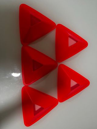 Set de conos de señalización en color rojo. - Diseño triangular. - Material plástico resistente.