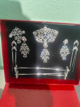 Conjunto de aderezo de plata con un diseño intrincado y brillante. - Incluye varias piezas para el cabello y pendientes. - Elaborado con detalles de pedrería. - Presentado en una caja roja.
