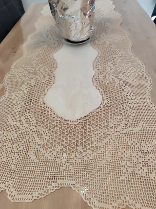 Elegante camino de mesa en color beige, perfecto para añadir un toque decorativo a tu mesa. Su diseño tejido le confiere una textura especial. - Color beige. - Diseño tejido con detalles. - Borde festoneado.