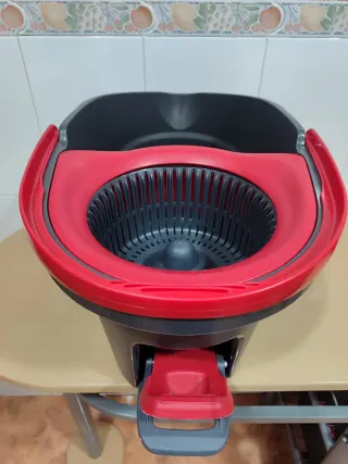 Cubo de limpieza Vileda con sistema de escurridor integrado. Su diseño es práctico y funcional. - Color gris oscuro y rojo. - Asa para facilitar el transporte. - Borde superior ancho.