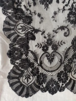 Elegante mantilla negra de chantillí, perfecta para complementar atuendos especiales. - Elaborada con delicado encaje de chantillí. - Diseño intrincado con motivos florales y volutas. - Borde festoneado con acabado detallado.