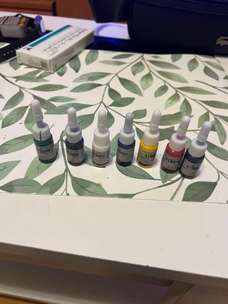 Set de tintas para tatuar de la marca Stigma, ideal para artistas. - Incluye 7 botellas de diferentes colores. - Botellas con aplicador. - Colores: verde, gris, blanco, azul, amarillo, rojo y negro.