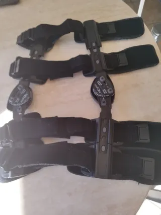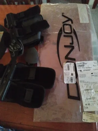 Rodillera ortopédica con articulaciones ajustables. - Diseño con correas de velcro para un ajuste personalizado. - Articulaciones laterales para mayor estabilidad. - Materiales resistentes y cómodos.
