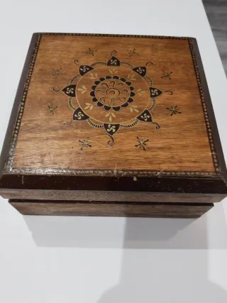 Caja de madera con un diseño decorativo en la tapa. - Material: Madera. - Diseño: Mandala central con detalles. - Borde decorado con puntos. - Muy bien conservada. - 20'5cm x 20'5cm x 9 de profundidad.