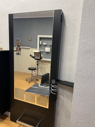 Sillones de peluquería con asiento y respaldo en dos tonos. Ideal para salones de belleza. - Base cromada. - Reposabrazos negros. - Respaldo texturizado beige. Tocadores con espejo posasecadores - color negro mate *Tocadores y sillones (170€) Sillon sala espera negro *(15€) Sala de espera negro y dorado con sofa (se abre y se puede almacenar cosas) Mostrador dorado con almacenamiento *(300€) Dos lavacabezas completos (250€) Carrito para guardar herramientas de peluqueria (30€)