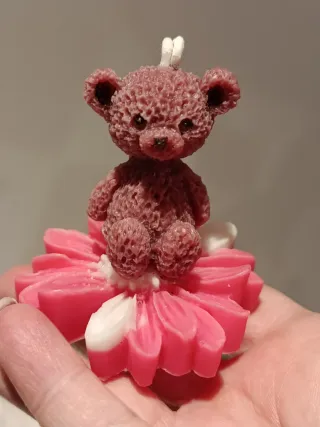 Preciosa velita artesanal con forma de osito Teddy sentado sobre una flor. - Fabricada en cera. - Diseño detallado de osito. - Base en forma de flor. - Color rosa y blanco.