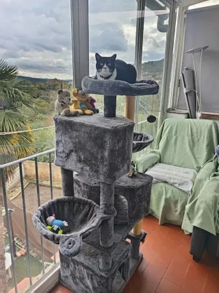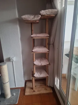 Estructura de varios niveles para gatos, ideal para jugar y descansar. - Varias plataformas y postes cubiertos de cuerda para rascar. - Cama o nido acogedor en la base. - Diseño multinivel para trepar y explorar. Usado menos de un año. Está como nuevo salvo una pata-rascador que está bastante rascada del uso. No tiene el pompón colgante. Apto para gatos grandes, muy muy estable, o para más de un gato simultáneamente. Regalo juguete con muelles para gato (ver foto). Solo recoger en Anaka (Irún). Está montado. Costó 99€.