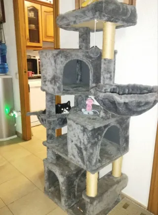Estructura de varios niveles para gatos, ideal para jugar y descansar. Cubierta de felpa gris suave. - Varias plataformas y un escondite. - Postes forrados de cuerda para rascar. - Incluye bola colgante para entretenimiento. Lo compramos y cuando lo montamos mi gato no quiso subirse ni acercarse