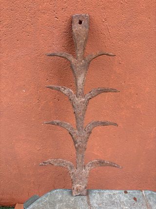 Pieza antigua de fundición con un diseño floral. - Material: Hierro fundido. - Aspecto rústico y oxidado. - Forma de tallo con hojas.