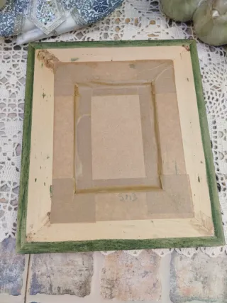 Pequeño cuadro decorativo que representa una ventana con reja y flores. - Marco de madera con acabado rústico en color verde. - Pintura detallada de una ventana con reja de hierro forjado. - Flores en tonos rosas y rojos. - Firma del artista Hernandez en la parte inferior.