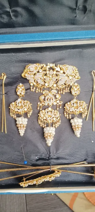 Conjunto de aderezo de racimo con perlas y pedrería, ideal para complementar tu atuendo. - Diseño elaborado con detalles de perlas y pedrería. - Incluye un broche principal y dos pendientes a juego. - Piezas doradas con un acabado brillante.