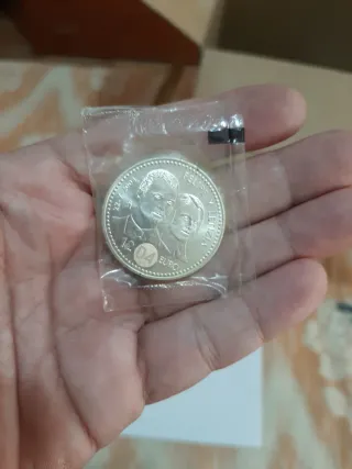 Moneda conmemorativa de plata. Está en su embalaje original sin abrir. Solo tiene un poco de suciedad porqué el embalaje tiene una pequeñísima abertura en una esquina. - Anverso: Retrato de Juan Carlos I y Sofía. - Reverso: Felipe y Leticia y año 2004.
