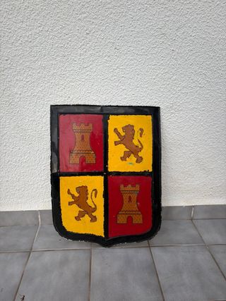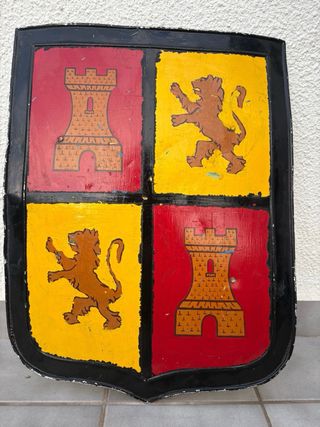 Escudo decorativo con diseño medieval. Presenta un cuartelado con dos castillos en rojo y dos leones rampantes en amarillo,es de hojalata, perfecto para simulaciones medievales o desfiles de moros y cristianos Castilla la Mancha - Diseño cuartelado. - Motivos de castillos y leones. - Borde negro.