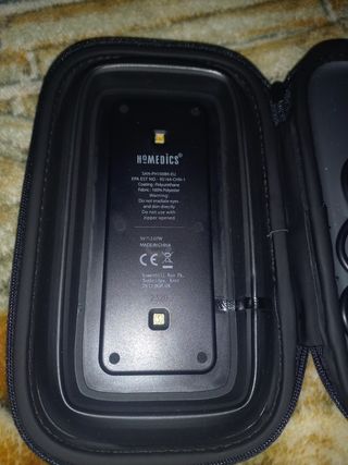 Dispositivo Sota Silver Pulser con banda ajustable. - Diseño ovalado en color blanco. - Dial giratorio para ajuste. - Indicadores luminosos 'ON' y 'SILVER'. - Banda de sujeción negra con velcro.