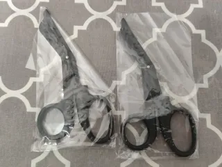 Dos pares de tijeras de emergencia negras, diseñadas para cortar telas. - Color negro. - Mango ergonómico.