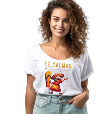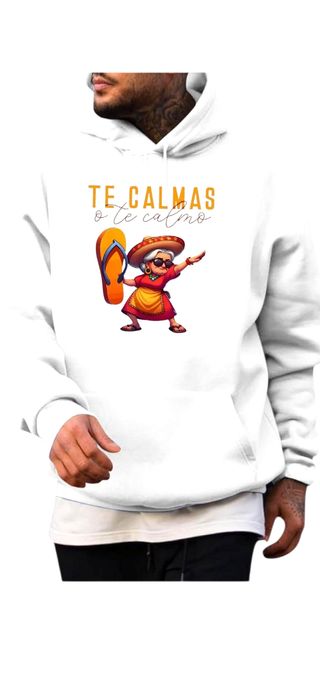 Tengo a la venta una camiseta y una sudadera con un diseño original y divertido. Son prendas únicas, ideales para un regalo. - La camiseta es de manga corta y tiene un corte holgado. - La sudadera es con capucha y de color blanco. - Ambas prendas presentan el mismo diseño de una abuela con gafas de sol y chanclas haciendo el dab. - El diseño incluye la frase "Te calmas o te calmo".