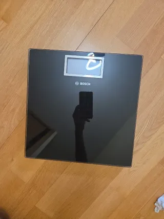 Pesa de la marca Bosch, con un diseño moderno y elegante en color negro. - Superficie de cristal. - Pantalla digital de fácil lectura.