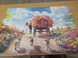 Puzzle de la marca Educa con 1000 piezas. La imagen muestra una pareja paseando con un carro lleno de flores y perros. - Diseño colorido y detallado. - Ideal para amantes de los puzzles y la naturaleza.