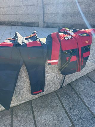 Traje de flotabilidad de la marca Mullion. - Color rojo, negro y amarillo. - Cintura elástica con logo. - Capucha de alta visibilidad.