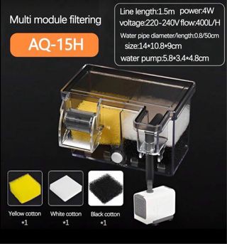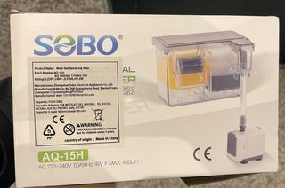 Filtro externo multifuncional para acuario de la marca SOBO, modelo AQ-15H. Diseñado para mantener el agua limpia y saludable,con bomba de agua sin estrenar. - Potencia: 4W - Voltaje: 220V-240V. - Caudal máximo: 400L/H. -con esponjas de filtración