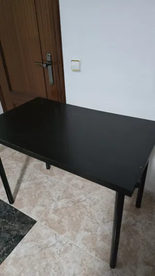 Mesa negra con patas metálicas útil como escritorio. La madera tiene algunos defectos pero las patas están en buenas condiciones. - Diseño moderno y minimalista. - Superficie lisa y fácil de limpiar. - Patas resistentes para mayor estabilidad.