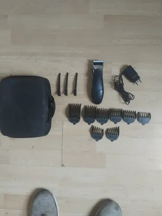 Set de cortapelos para el cuidado personal. - Incluye cortapelos, cargador y varios peines. - Viene con una funda para guardarlo todo.
