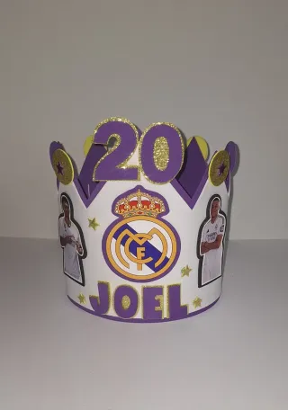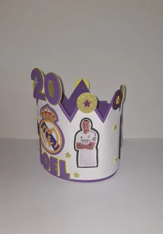 - Corona hecha a mano de goma eva,(Real Madrid). -Si tienes alguna idea no dudes en comentarmelo. -Te la hago personalizada con el nombre, edad... Patrulla canina, Unicornio, Pocoyo, Mickey, Minnie, Ladybug, Cat noir, Barça, Tik tok, Mario bross, Fornite, Bob esponja, Minecraft, Pepa pig, Baby shark, Pokemon, Bing, Bebe jefazo, Among Us, etc... *El precio no incluye coste de envío. *Solo hago envíos a través de wallapop. -Preguntame sin compromiso.