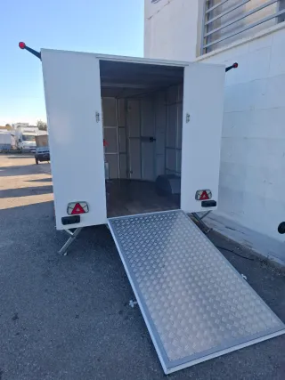 Remolque cerrado de fibra, ideal para transporte. - Color blanco. - Puerta trasera con cierre de seguridad. - Patas de apoyo estabilizadoras. - Luces traseras de señalización. Ideal para autocarabanas Moto, sillas, mesas, cocina, etc..