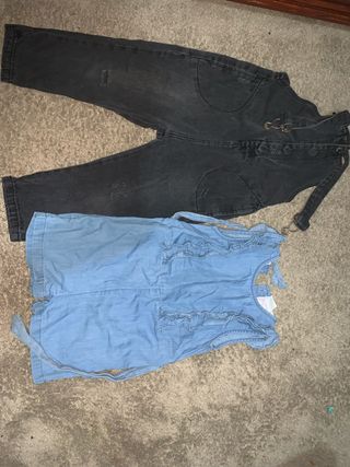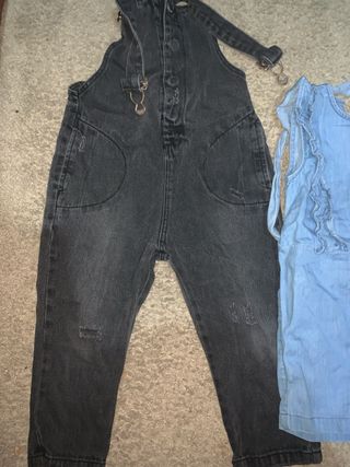El negor vale 7€ El azul vale 3€ Conjunto de ropa infantil compuesto por un mono vaquero azul y un peto negro. - Mono vaquero azul con volantes. - Peto vaquero negro con detalles desgastados y tirantes.