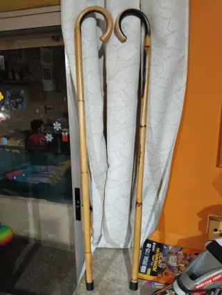 bastones de junco del 21 con empuñadura curva y taco de goma en la base. Son ligeros y fáciles de sujetar. Precio por unidad - Material: Junco natural. - Empuñadura: Curva. - Base: Taco de goma.
