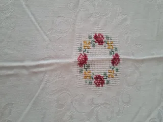 Elegante mantel blanco con un delicado bordado floral. _ mide 1,30 por 1,40 - Diseño jacquard con motivos florales. - Bordado a mano con hilo de colores. Regalo el centro de la foto